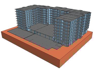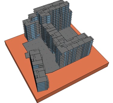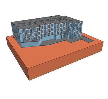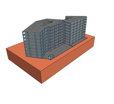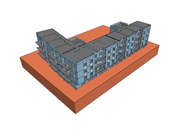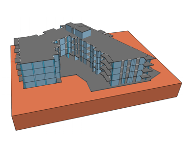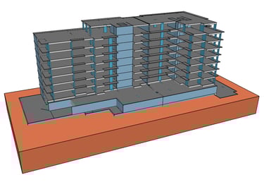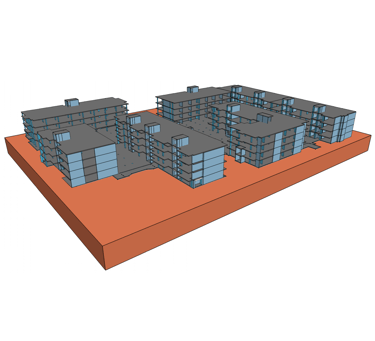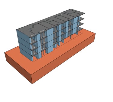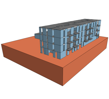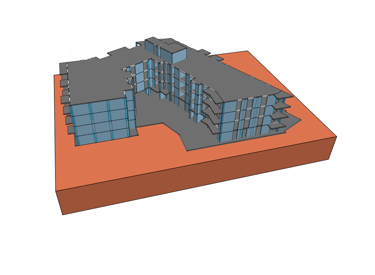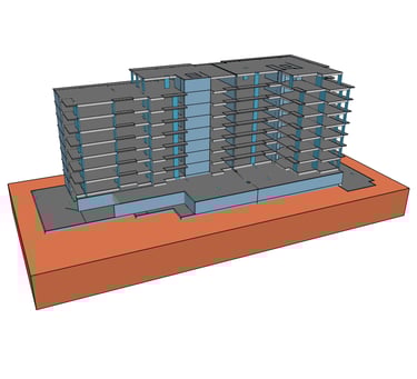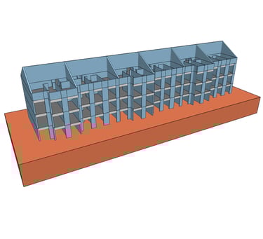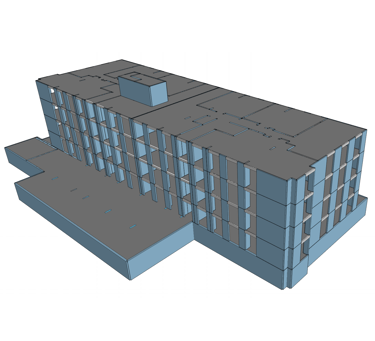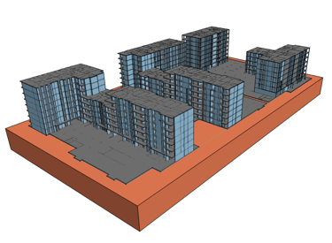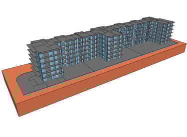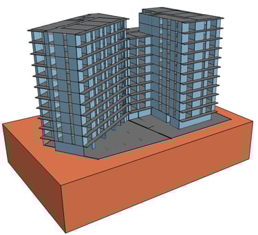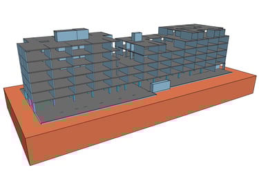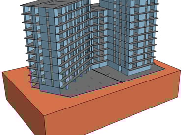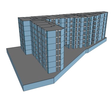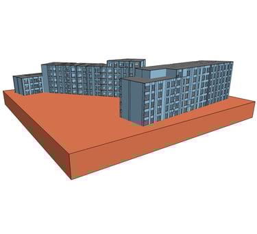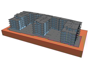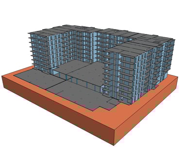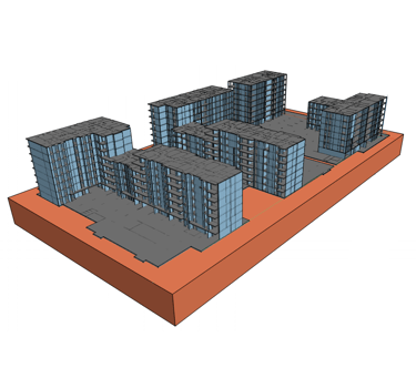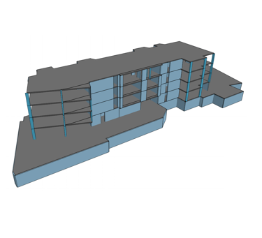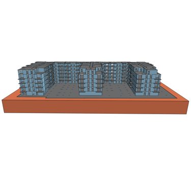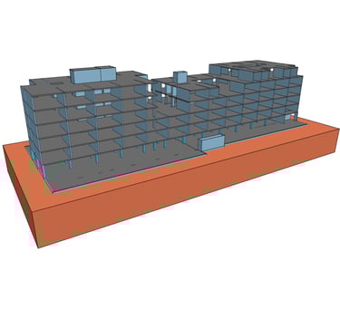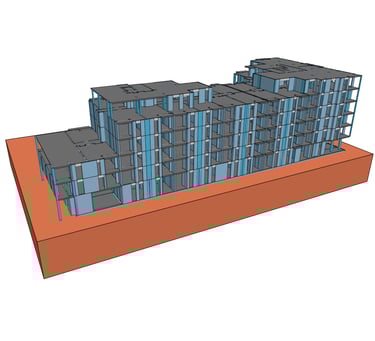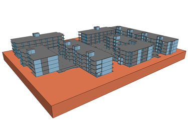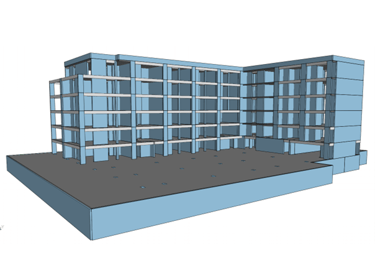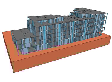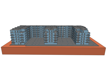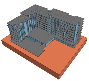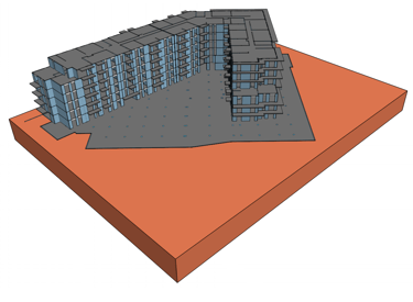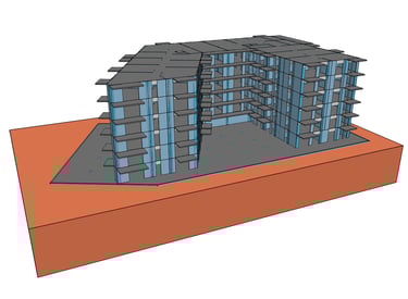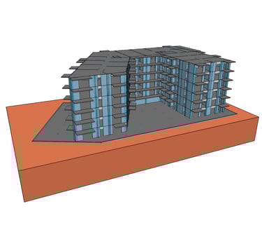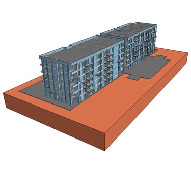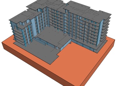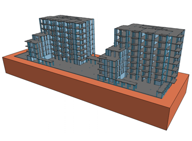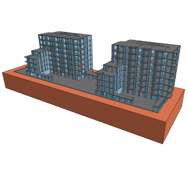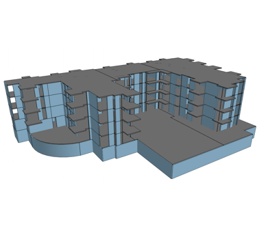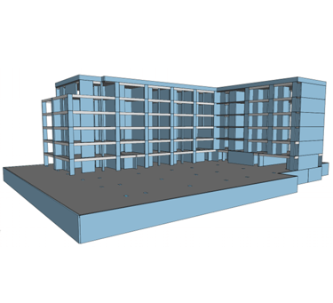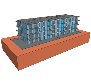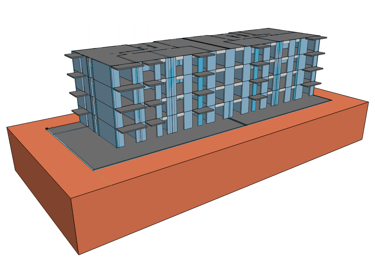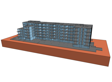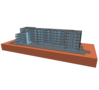 Multi-family residential building with an underground garage. Seven floors above ground. The model also includes a retaining wall.