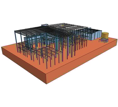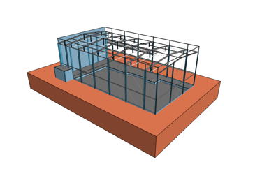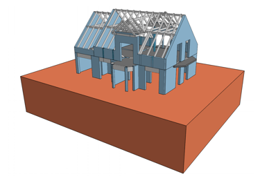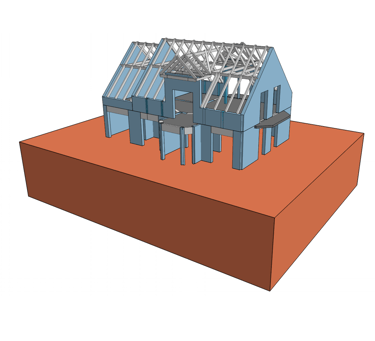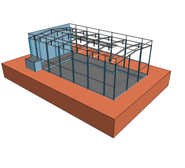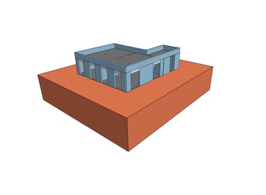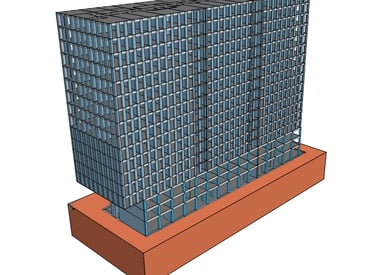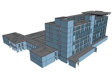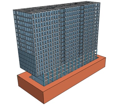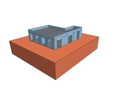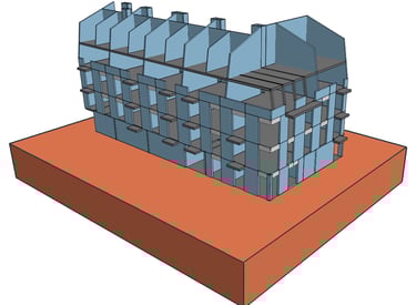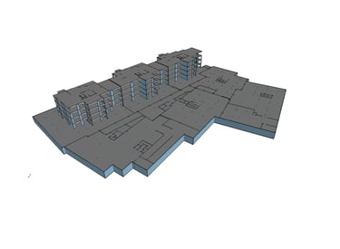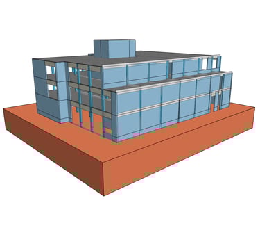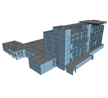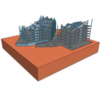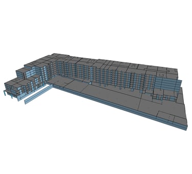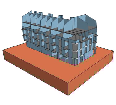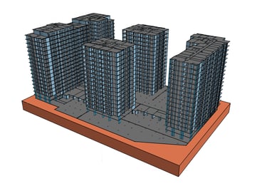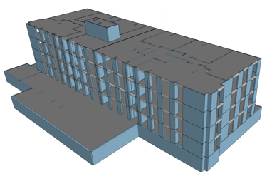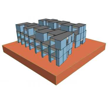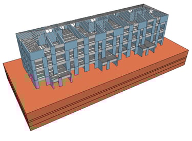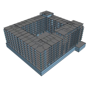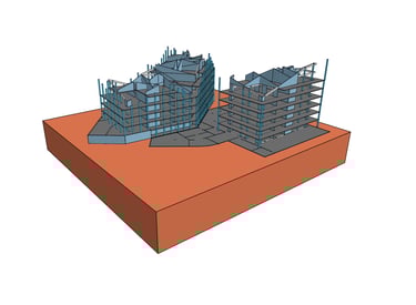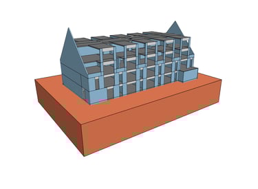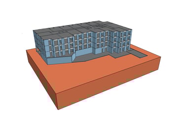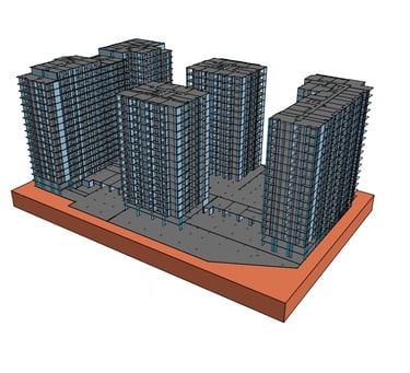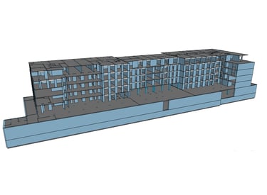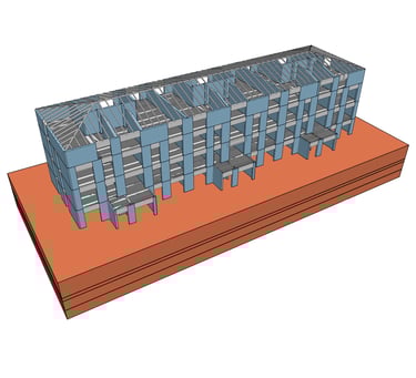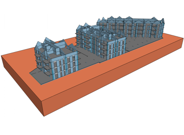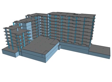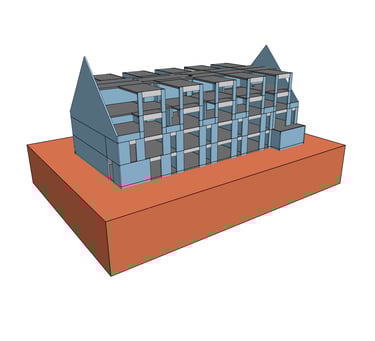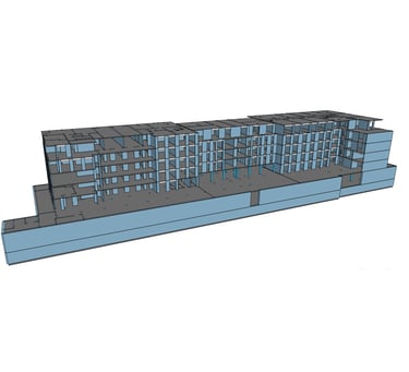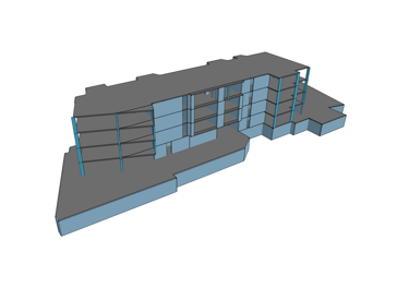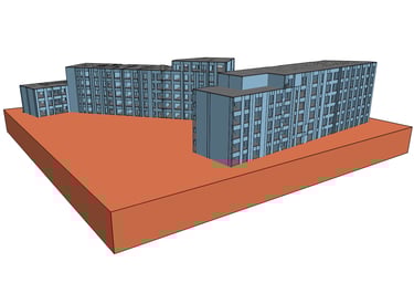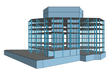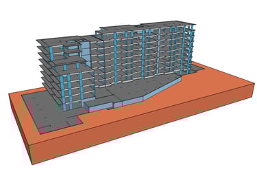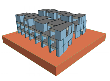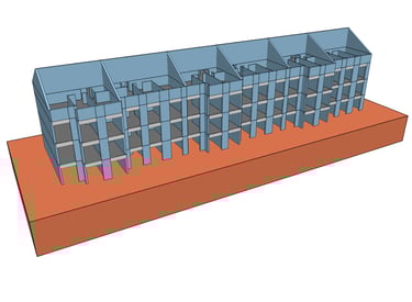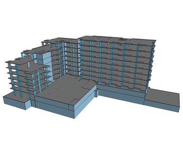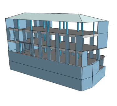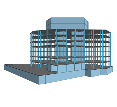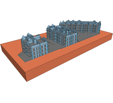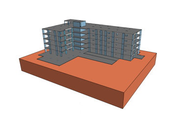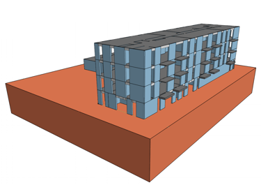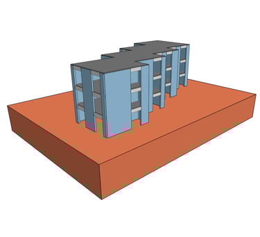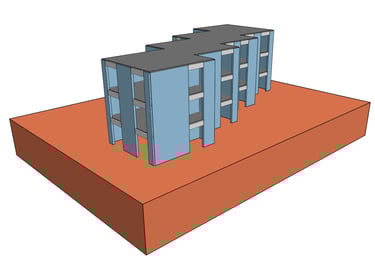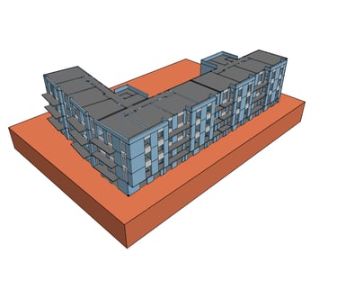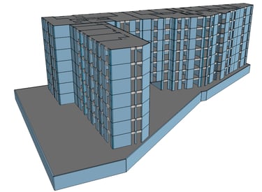 Multi-family residential building with an underground garage. Seven floors above ground. The model also includes a retaining wall.