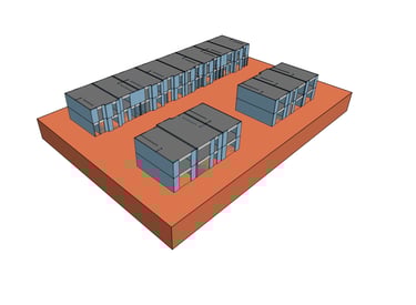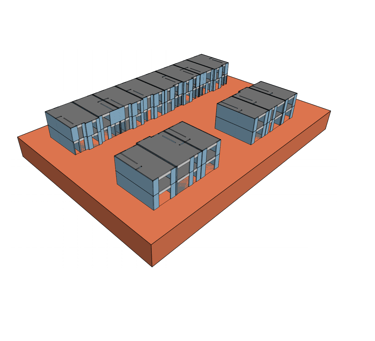 Three multi-family residential buildings connected by an underground garage, three above-ground floors.